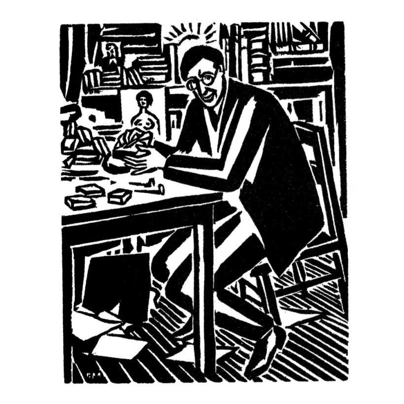 Pick up a copy of Frans Masereel’s Passionate Journey, and open the book at any page. There, in lines both broad and fine, lines originally gauged, carved or chiselled into pearwood with a selection of woodcutting tools, are two of 165 striking images of a man in both everyday and red-letter day situations. At first he is fresh-faced, but later he bears the marks of life’s excesses and disappointments, of time’s inexorable march. Each scene is both a story in its own right, and a continuation of the man’s overarching tale, from his arrival in a great city, to his death and indeed his afterlife. So we see him lost in a crowd; looking down into the water of a canal, his head in his hands; visiting an art gallery; making love to a married woman, then walking the streets, his face lit up with euphoria; gathering a flock of birds about him; ice-skating on a river; buying fresh produce from the fruit and vegetable market; climbing up a pole to hang joints of meat from the top of it, then (back on the ground) aiming an arrow at them; reading under a tree, and later in a library; attending a political meeting and speaking to a rally; fallen grief-stricken over the deathbed of a young woman; and travelling widely, visiting as many destinations as a travel writer might, learning about other cultures as he goes, and perhaps concluding on his return to the city that wherever you are in the world, people are not so very different from each other.